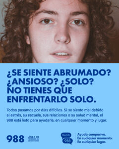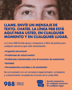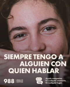 La Línea 988 de Prevención del Suicidio y Crisis está disponible 24/7 para cualquier persona que enfrente angustia emocional, problemas relacionados con el consumo de alcohol o drogas, o incluso soledad.