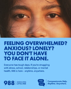 The 988 Suicide & Crisis Lifeline is available 24/7 for anyone in emotional distress, facing substance use challenges, or even loneliness.