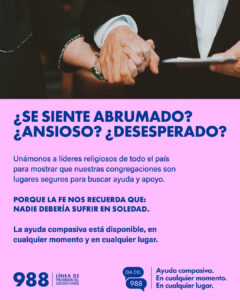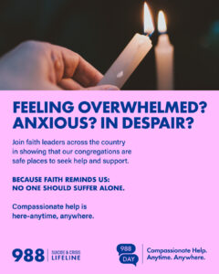 - Host a 988 Day event at your place of worship: prayer service, discussion group, or community meal focused on mental health and hope