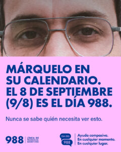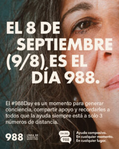 La salud mental importa. La Línea 988 de Prevención del Suicidio y Crisis brinda apoyo sin juicios 24/7. El 8 de septiembre, ayúdenos a difundir que la ayuda está a solo tres números de distancia.