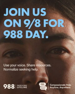 On 988 Day, we’re inviting everyone to help amplify this critical resource. Over the coming weeks, we’ll [share, invite, plan …fill in with what you are planning for 988 Day].